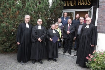 Vor dem Einzug in den Gottesdienst am Portal des Lutherhauses.