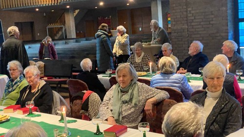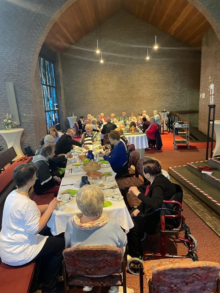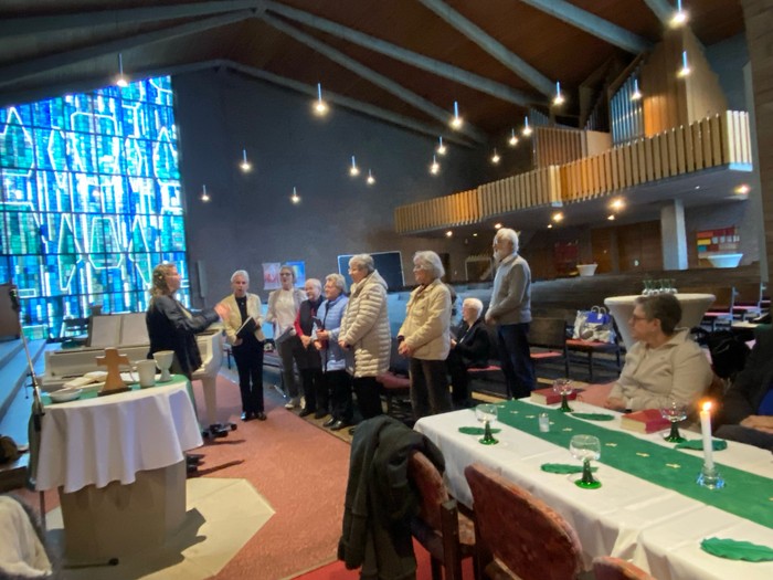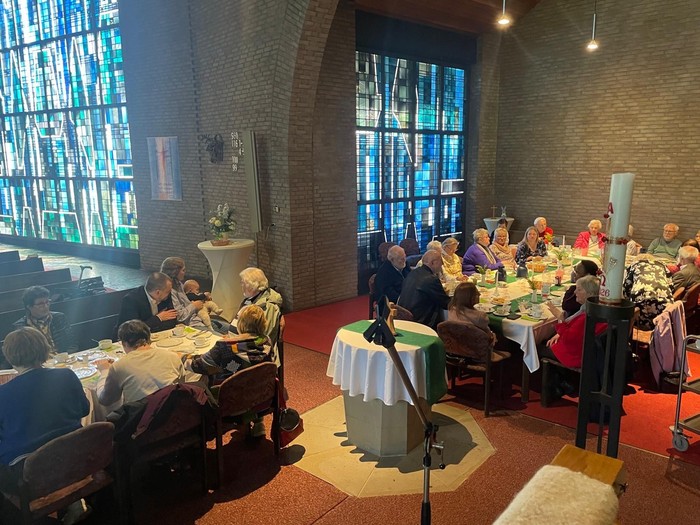 In der Petrusgemeinde nahmen an Feiernde auch in diesem Jahr wieder Platz an gedeckten Tischen: zur Feier der Einsetzung des Heiligen Abendmahls an Gründonnerstag und zum Gottesdienst mit Brunch an Ostermontag. Die Tische im Seitenschiff der Dreifaltigkeitskirche waren in den Farben grün und weiß geschmückt. Zur musikalischen Begleitung an Gründonnerstag trug der Lutherchor unter Leitung von Bettina Oschmann Passions- und Abendmahlslieder vor. Das sich anschließende Agapemahl ließ Raum für Gespräche mit den Tischnachbarn.
